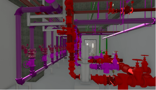 4、施工样板展示。通过navisworks和Fzuro软件进行水泵设备房施工工艺和地下室管综复杂区的安装动画模拟,能够将复杂工艺以动画形式展现,准确的向作业人员进行施工安装技术交底。